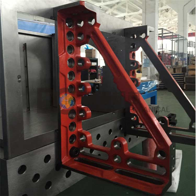 特性: 1. 可固定孔位鎖緊或可調定位固定鎖緊 2. 角鐵固定后有三個方向可作柔性連接 3. 槽型孔位方便連接微調 4. 標準的90度直角可作垂直主基礎定位 5. 夾具臺向四周的延伸的支撐件 6. 整體鑄造成型,美觀、穩定耐用 7. 可任意調整并能準確定位 8. 平放使用可作為大型定位使用